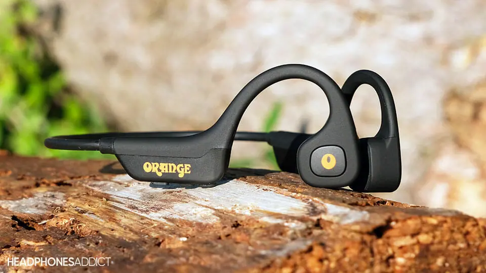 Editorrating 3.5 Orange O Bones are decent bone conduction headphones with excellent comfort and stability for sports activities. But they won’t blow you away with their sound quality. Find out why in the Sound category below. Bone conduction technology transmits sound waves by vibrating your facial bones directly into your middle ear, leaving your ear canal fully open. Learn more about how bone conduction headphones here. However, providing you with full awareness brings many drawbacks, like the poorer sound quality and strange, tingling sensation from the vibrating drivers. But let’s say you want to listen to music yet remain perfectly aware of your surroundings. Are Orange O Bones the headphones for you? How do they perform outdoors? Find all the information in our detailed review down below. We test and evaluate headphones using a standardized 9-point methodology. When you buy through links on our site, we may earn a commission. Learn more. Excellent comfort & stability for exercising Above-average indoor Bluetooth range of 60 feet Decently durable with rubber coating and an IPX4 rating Excellent battery life of 10+ hours and USB-C fast-charging Dissapointing sound (compared to other headphones) Mediocre microphone performance Editorrating 3.5 By HeadphonesAddict Userratings 0 User Ratings: 0 Category Sound Comfort & Fit Durability Battery Features Noise Isolation Bluetooth Value Our rating 3.0 4.5 4.0 4.5 2.5 3.0 4.5 2.5 User rating 0 0 0 0 0 0 0 0 RATE THIS MODEL User Rating _._ No Rating 1.0 Bad 1.5 Meh 2.0 Acceptable 2.5 Average 3.0 Good 3.5 Almost great 4.0 Great 4.5 Almost Perfect 5.0 Fantastic User Rating _._ No Rating 1.0 Bad 1.5 Meh 2.0 Acceptable 2.5 Average 3.0 Good 3.5 Almost great 4.0 Great 4.5 Almost Perfect 5.0 Fantastic User Rating _._ No Rating 1.0 Bad 1.5 Meh 2.0 Acceptable 2.5 Average 3.0 Good 3.5 Almost great 4.0 Great 4.5 Almost Perfect 5.0 Fantastic User Rating _._ No Rating 1.0 Bad 1.5 Meh 2.0 Acceptable 2.5 Average 3.0 Good 3.5 Almost great 4.0 Great 4.5 Almost Perfect 5.0 Fantastic User Rating _._ No Rating 1.0 Bad 1.5 Meh 2.0 Acceptable 2.5 Average 3.0 Good 3.5 Almost great 4.0 Great 4.5 Almost Perfect 5.0 Fantastic User Rating _._ No Rating 1.0 Bad 1.5 Meh 2.0 Acceptable 2.5 Average 3.0 Good 3.5 Almost great 4.0 Great 4.5 Almost Perfect 5.0 Fantastic User Rating _._ No Rating 1.0 Bad 1.5 Meh 2.0 Acceptable 2.5 Average 3.0 Good 3.5 Almost great 4.0 Great 4.5 Almost Perfect 5.0 Fantastic User Rating _._ No Rating 1.0 Bad 1.5 Meh 2.0 Acceptable 2.5 Average 3.0 Good 3.5 Almost great 4.0 Great 4.5 Almost Perfect 5.0 Fantastic CONTENTS (show more) Find more: Best bone conduction headphones Sound 3.0 Good Orange O Bones output decent bass, a harsh midrange, and a quiet treble. On the other hand, the sound feels very spacious. Music fidelity was never a strength of bone-conducting headphones. Vibrations have to cross many obstacles to get into your ear, which is the reason they sound quite muffled and lack detail. So, don’t expect Orange O Bones to replace your studio monitors or even budget earbuds. However, despite the poor sound quality, headphones’ primary function is to play music, so let us dissect how well the O Bones do. Orange O Bones headphones in all their glory. Bass: Pleasing quantity but only in a quiet room Lower frequencies are a known Achilles’ heel of bone conduction. However, at least with Orange O Bones, they seem to somewhat resolve the issue. Sure, there’s practically no sub-bass, but the upper region is decently punchy, especially on higher volumes. Bass prominent songs like “Get Lucky” by Daft Punk sound quite pleasing, letting you hear both the drum kicks and bass guitar licks. Of course, to hear any bass, you have to listen to them someplace quiet. Using them outdoors quickly sucks away most of the low-end, forcing you to raise the volume. One solution is to use the included earplugs. However, those isolate you from the outside world, and the entire point of this type of headphones is to make you aware of potential dangers. Furthermore, ear plugs drastically boost the bass, making the sound overly muddy and bloated. Midrange: Quite sharp in the upper region Mid-frequency response is a bit uneven, especially in higher registers. Lower mids are relatively natural, which is evident in the previously mentioned “Get Lucky” song. The soft rubber cushions are a contact point that vibrates your bones. However, the upper midrange gets shouty and thin very quickly, even on lower volumes. That makes songs like “The Night We Met” by Lord Huron hard to listen. Metal tracks with lots of electric guitar distortion play especially badly on the O Bones, resembling earbuds you get for free at the museum. Also, the entire midrange lacks detail. There’s very little texture in vocals and instruments, even string ones. The sound truly isn’t meant for analytical listening. Treble: Smooth but very quiet The lack of detail continues in the higher frequencies. Overall, the treble performance is smooth and quite pleasing. However, it’s so quiet that it gets easily masked by the shouty midrange. Interestingly, the shy treble doesn’t hurt the imaging accuracy. You can very distinctly hear sounds moving from left to right. As long as you aren’t listening to cymbals. Since the treble is so quiet, you can barely hear the cymbals floating around your head in Haken’s “Atlas Stone” track. Moving to the soundstage, it’s big, pushing sounds further out of your head. However, a big soundstage only works well when paired with good detail. In this case, it only makes you feel like you’re listening to music in an echoey hall. Sound quality isn’t bone conduction’s strength. To summarize all the facts, Orange O Bones (and all bone-conduction headphones in general) aren’t for those seeking audio quality. Bone conduction’s main purpose is to safely listen to music while jogging on the streets and not sonic fidelity. Also, they’re 